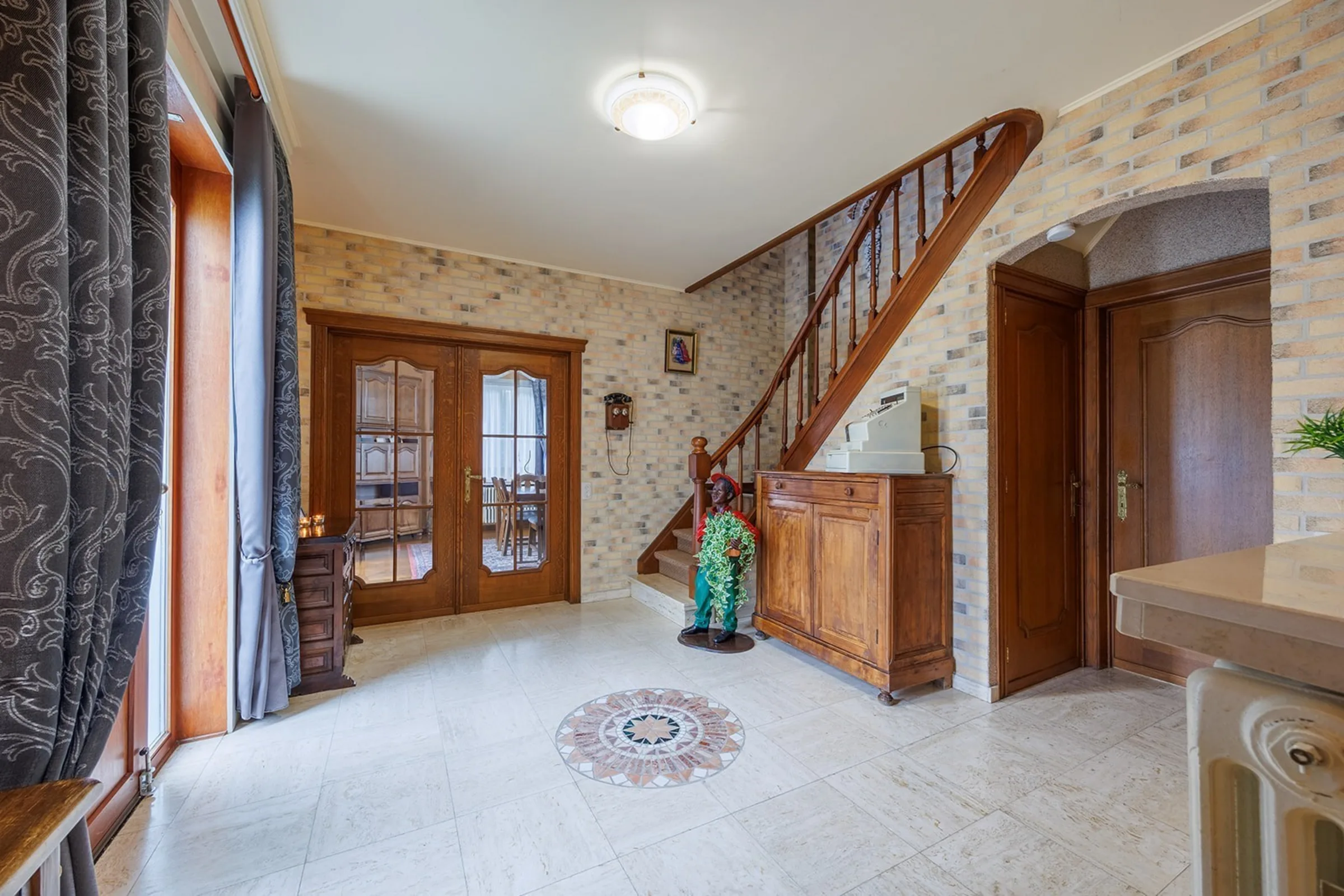 Je komt binnen in een ruime inkomhal met rechts een groot bureau. Links leiden dubbele deuren naar de lichtrijke leefruimte (zit- en eetplaats) met parket en houthaard. Aansluitend: een tweede eetruimte en een goed uitgeruste keuken met twee bergingen. De veranda kijkt uit op de tuin en laat je elk seizoen genieten. Op het gelijkvloers zijn er ook nog een douchekamer met toilet en een kelder.